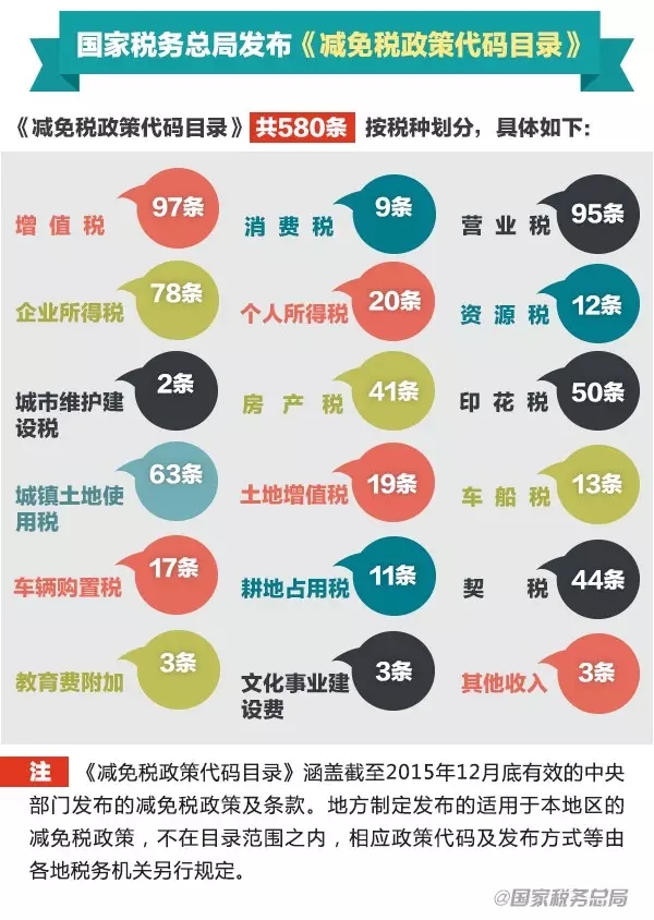 新版《減免稅政策代碼目錄》(以下簡稱《代碼目錄》)包括580條,涉及增值稅、消費(fèi)稅、營業(yè)稅、企業(yè)所得稅、個(gè)人所得稅、資源稅、房產(chǎn)稅、城市維護(hù)建設(shè)稅、印花稅、契稅、城鎮(zhèn)土地使用稅、土地增值稅、車船稅、車輛購置稅、耕地占用稅、教育費(fèi)附加和文化事業(yè)建設(shè)費(fèi)等。