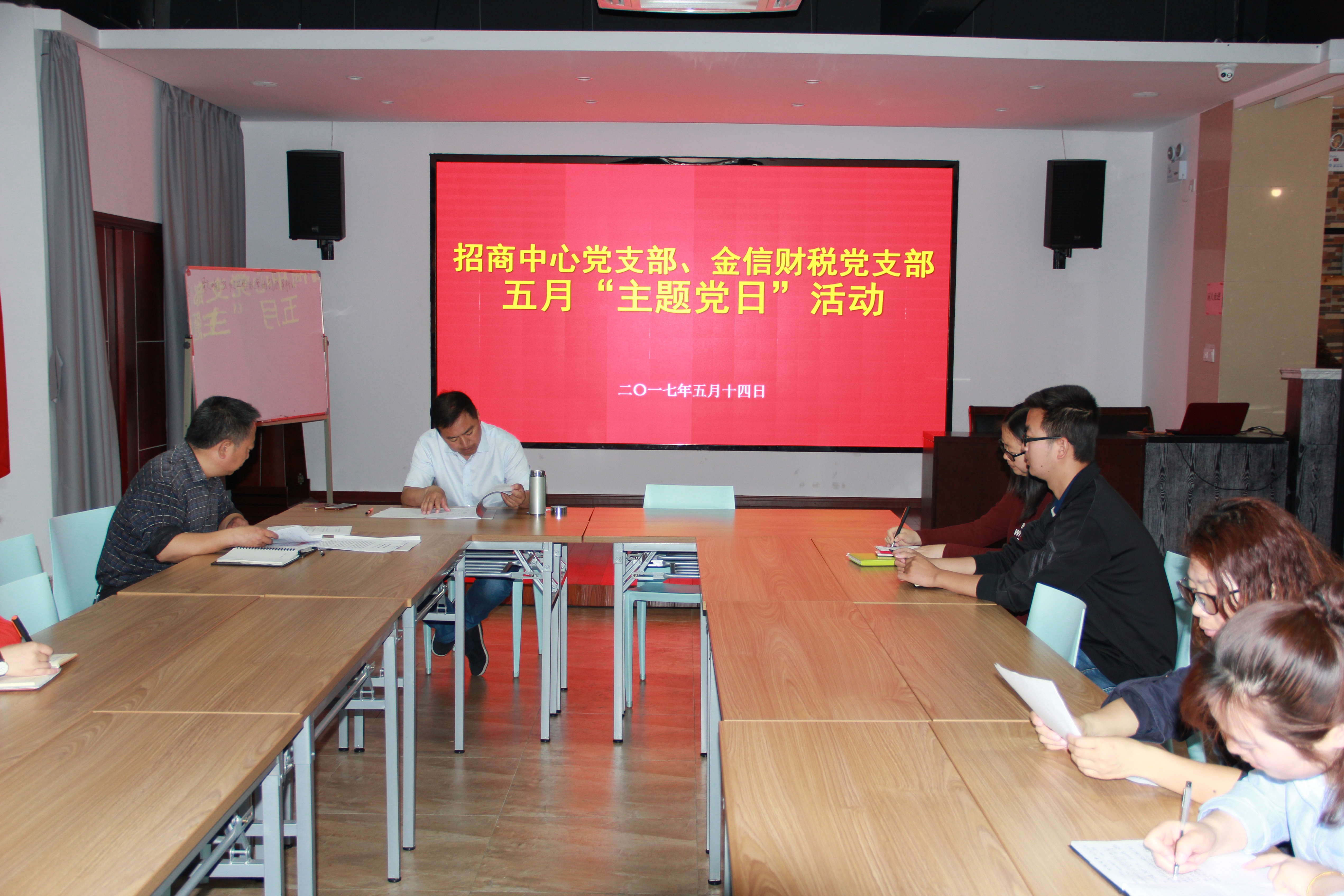 2017年5月14日是全縣的“主題黨日”,招商中心、金信財稅2個支部聯合舉辦了活動。當天,2個支部合計14名黨員、建黨對象、積極分子在招商中心大樓一樓眾創空間召開會議,會議學習和傳達了《關于在基層黨組織標準化建設中開展“主題黨日”活動的通知》、習近平系列講話《扎實推動經濟社會持續健康發展 以優異成績迎接黨的十九大勝利召開》等一系列文件精神。