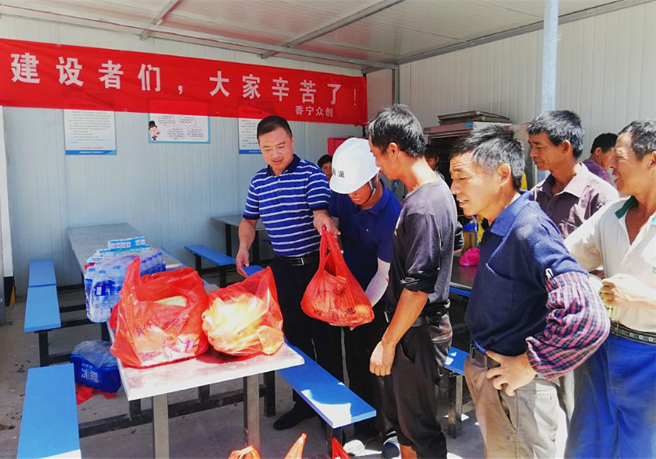 8月2日,中心主任胡海鋒來到香寧科技創(chuàng)業(yè)服務(wù)中心暨歙縣退役軍人創(chuàng)業(yè)孵化和就業(yè)促進基地項目建筑工地,對冒高溫、戰(zhàn)酷暑的建設(shè)工友進行親切慰問。胡海鋒主任將西瓜、礦泉水和解暑藥等慰問品分發(fā)到建設(shè)者手中,并感謝大家的辛勤付出,同時叮囑大家一定要注意防暑降溫,確保安全生產(chǎn)。