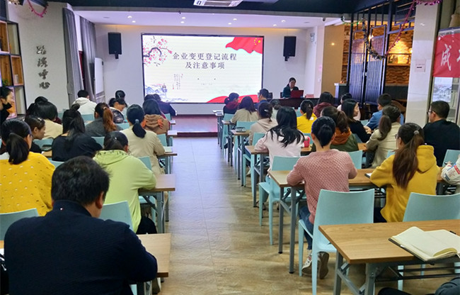 10月23日,由受理中心汪蕓主講的“企業變更登記流程及注意事項”專題PPT分享在一樓眾創空間舉行,園區企業負責人和中心財稅服務人員40余人參與此次分享。